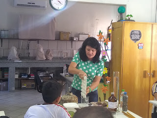 Na ocasião, foram realizadas demonstrações e experimentos para trabalhar os conceitos de matéria, a relação entre massa e volume, conceito de densidade e as diferentes densidades apresentadas por algumas substâncias químicas.